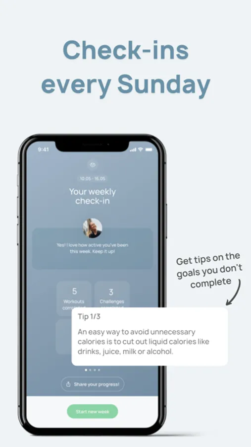 Experience the support & accountability from your Personal Trainer with an overview of how your week went, advice for the goals you struggled with & new goals for the week ahead. Helps you always stay on track with your workouts