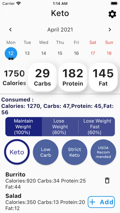 - This food tracker app shows you Keto , Low Carb, Strict Keto, and USDA recommended diet numbers - just pick or switch to your favorite diet