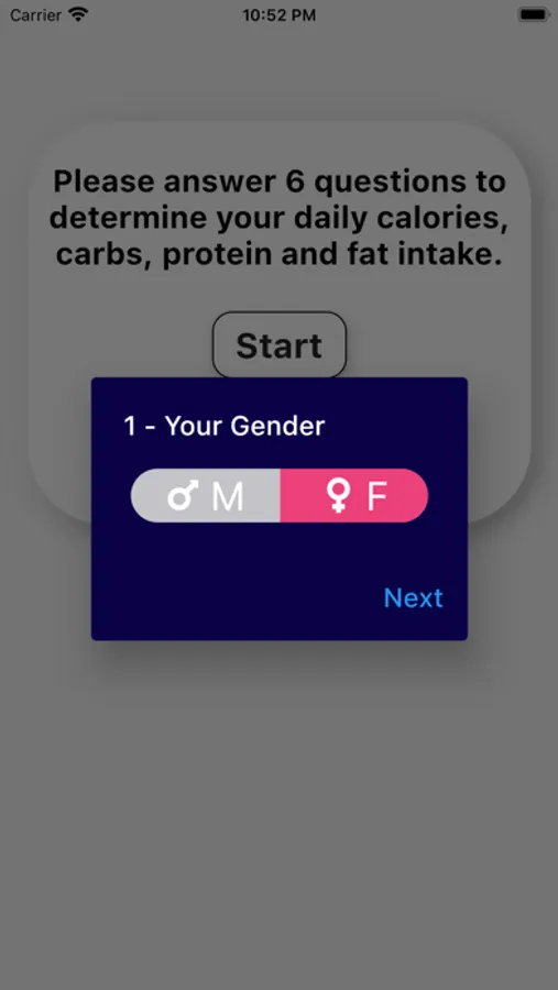 - App calculates your daily carbs, calories, protein, and fat, based on your age, weight, height, activity level etc.