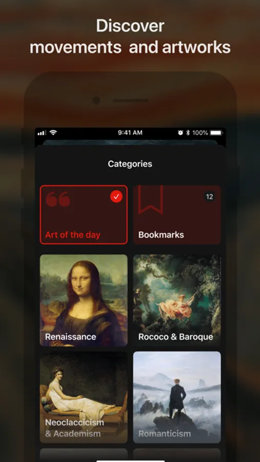 Our app provides you with access to art masterpieces from all over the world and lifts the veil on the suppressed behind the canvas background. You will not only understand and feel the artwork itself, but will also discover whole new worlds, travel through centuries, become friends with Raphael and Andy Warhol, plunge into the atmosphere of Renaissance, Impressionism, Abstract Expressionism, and other art movements.