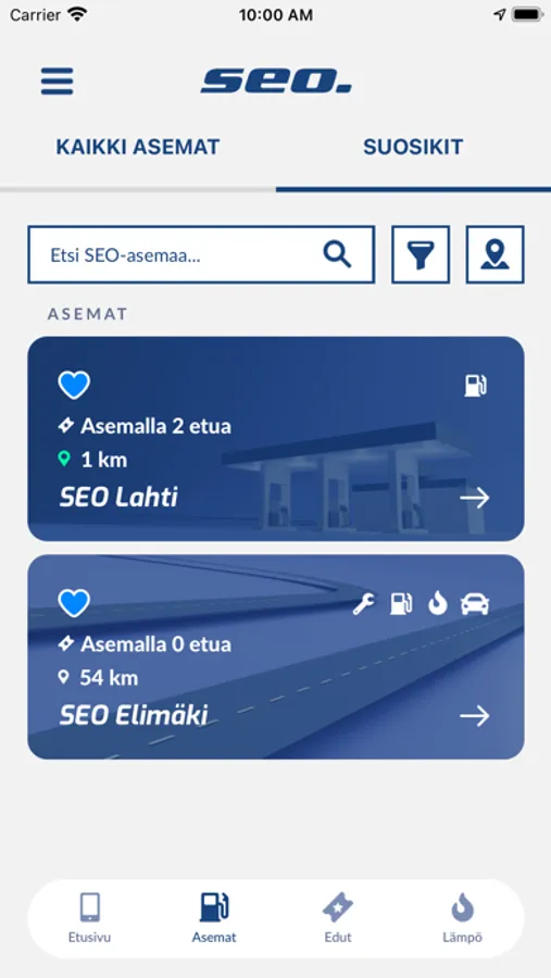 Matkareitin suunnittelu on SEONapilla sujuvaa ja lähimmät SEO-asemat voi hakea palveluittain. Asemista voi valita omat suosikkinsa, jolloin asemien tarjoamia palveluita ja etuja on helppoa seurata. SEONapissa saat rahanarvoisia etuja ketjutasolla ja kauppiasvetoisilla asemillamme.
