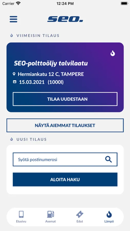 SEONapilla voi tilata kätevästi polttoöljyä lämmitykseen ja moottorikäyttöön. Ensimmäisen tilauskerran jälkeen polttoöljyn tilaushistoria tallentuu appiin, jonka jälkeen ”uusi aiempi tilaus”