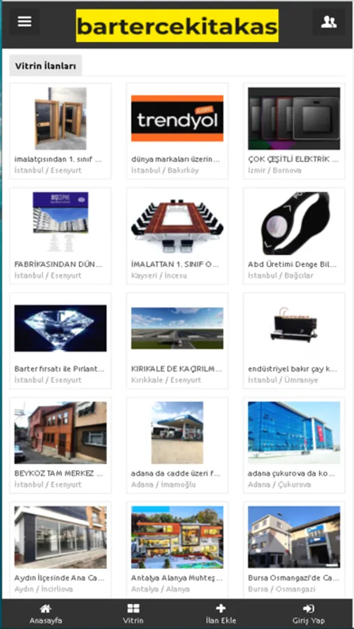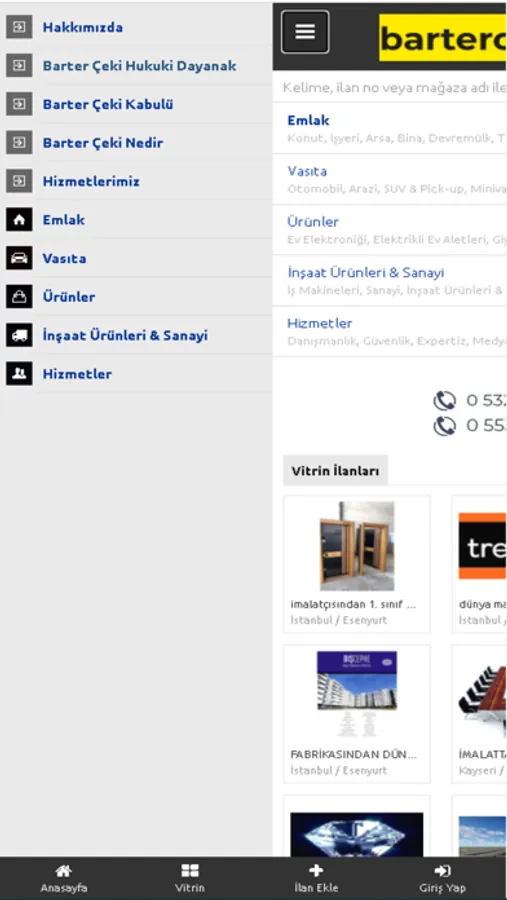 OTOMOTIV, DENİZ ARAÇLARI,İNŞAAT MALZEMELERİ, HİZMET SEKTÖRÜ VE GAYRİMENKUL ALANINDA BARTER ŞİRKETLERİNE VE BARTER ÇEKİ OLAN ŞAHIS VE FİRMALARA, AYRICA SAHİP OLDUKLARI GAYRİMENKUL VE DİĞER FARKLI ÜRÜNLERİNİ VERİP KARŞILIĞINDA DENİZ ARAÇLARI VEYA GAYRİMENKUL ALMALARI KONUSUNDA CİDDİ ,SORUMLULUK ALARAK İŞ BİTİMİNİN TAKİBİNE KADAR TARAFLARA ÇÖZÜM ORTAĞI OLARAK HİZMET VERİYORUZ.