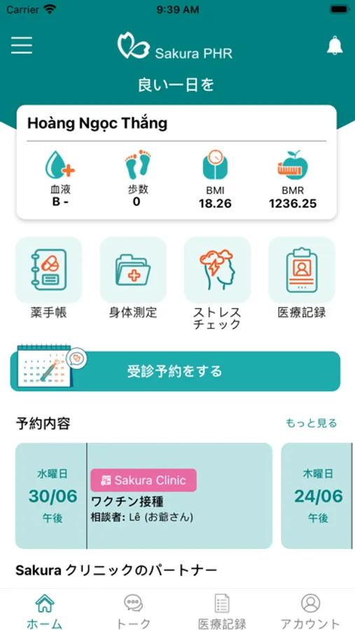 さくら - PHR は、ベトナムに住み、働き、旅行する日本人にヘルスケア サービスを提供する先駆的な電子ヘルス アプリケーションです。ベトナム滞在中はもちろん、日本に帰国する際にも、健康を気遣い、守る旅のお供になれれば幸いです。 Sakura-PHRを使用すると、医療記録や関連文書を保存することなく、健康状態の監視、病歴の検索、予約の予約を簡単に行うことができます。 日本に帰国したり、他の国に引っ越したりしても、いつでもどこでも、遠隔地で健康管理を行うためのトータルソリューションを提供します。