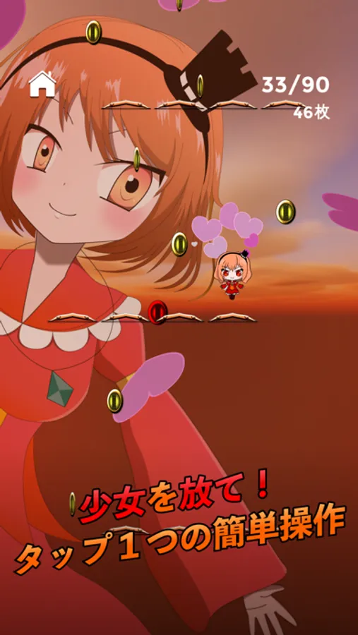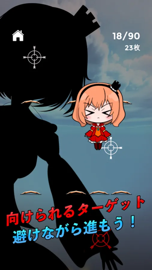 少女が弓に飛び乗り、大きく放たれます。タップ1つで少女を操作し、障害物を避けながら上を目指していきましょう。