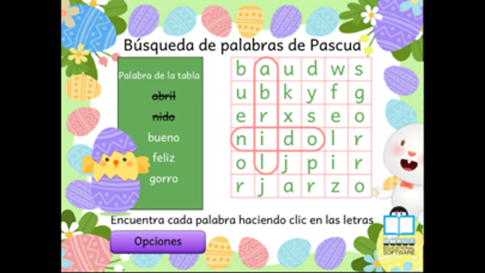 When each word is found, a chick will spring out of the egg on the screen, and when all the words have been found, the rabbit will perform a somersault across the screen!