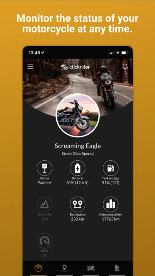 Connect live to your motorcycle at any time and check all key functions. Configure warnings and prevent unexpected surprises. Receive evaluations of your rides and determine what you want to have analyzed. Share Insights with friends or just enjoy them for yourself and benefit from safety and protection. Anytime, unfiltered and reliable.