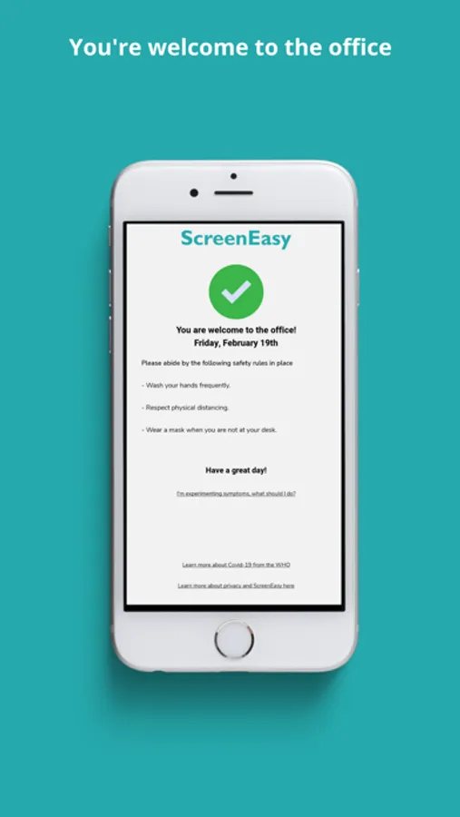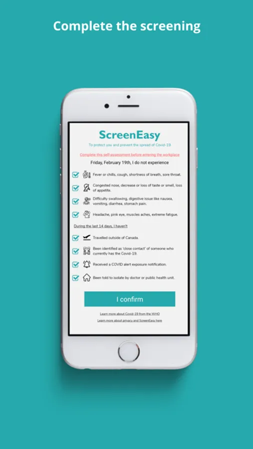 ScreenEasy is a secure mobile application allowing you to determine whether or not you are allowed to go to work or if you should stay home and self-isolate.