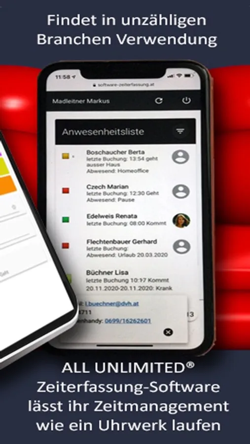 Um eine möglichst hohe Akzeptanz der ALL UNLIMITED® Zeiterfassung bei den MitarbeiterInnen zu erreichen, wurde großer Wert auf BenutzerInnenfreundlichkeit und Übersichtlichkeit gelegt. Zeitbuchungen für die vergangenen Tage und Informationen zur Vollständigkeit der Daten sind den MitarbeiterInnen genauso abrufbar wie Zeitsalden oder Urlaubsstand. Beim Urlaubsstand kann auch ein beliebiger Zeitpunkt in der Zukunft gewählt werden – der Resturlaubsstand wird dann unter Berücksichtigung von geplanten Urlauben und eventuellen Neuansprüchen berechnet und angezeigt.
