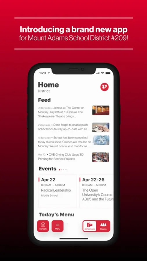 The event section shows a list of events throughout the district. Users can add an event to your calendar to share the event with friends and family with one tap.