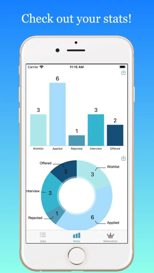 Explore your stats in a beautiful visual display via a pie or bar chart, and save pictures of them to share later!