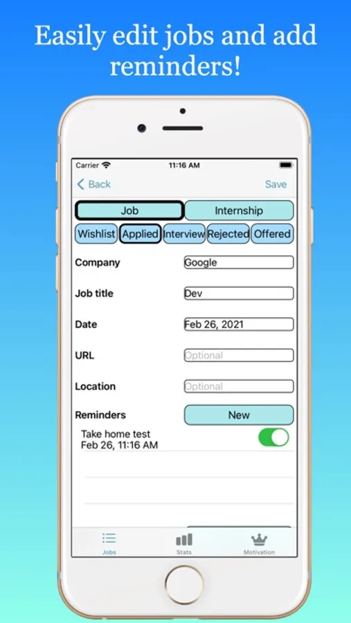 Quick and intuitive UI allows easy adding of applications, editing, adding reminders and deleting old applications.