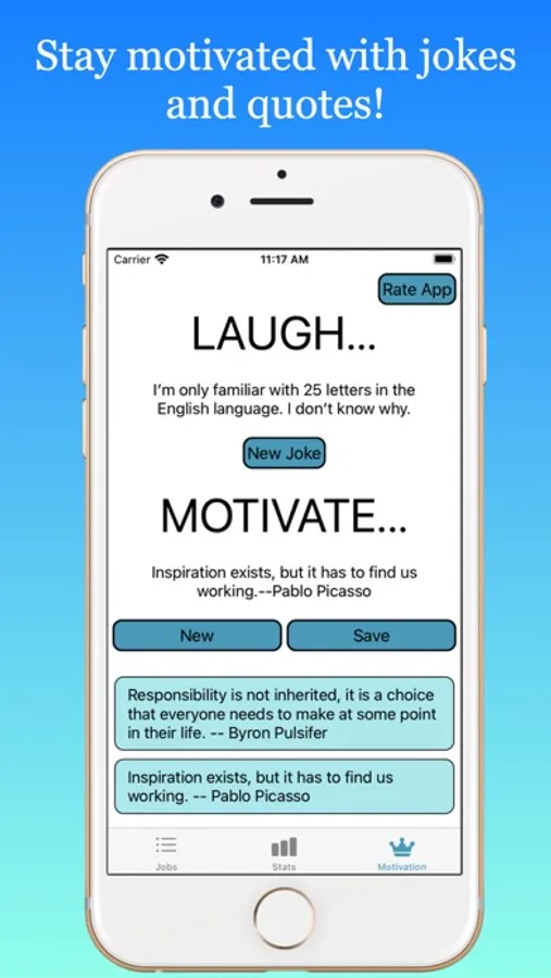 Keep your motivation high and your spirits higher as you enjoy jokes and over 1500 motivational quotes. You can also save your favorite quotes!