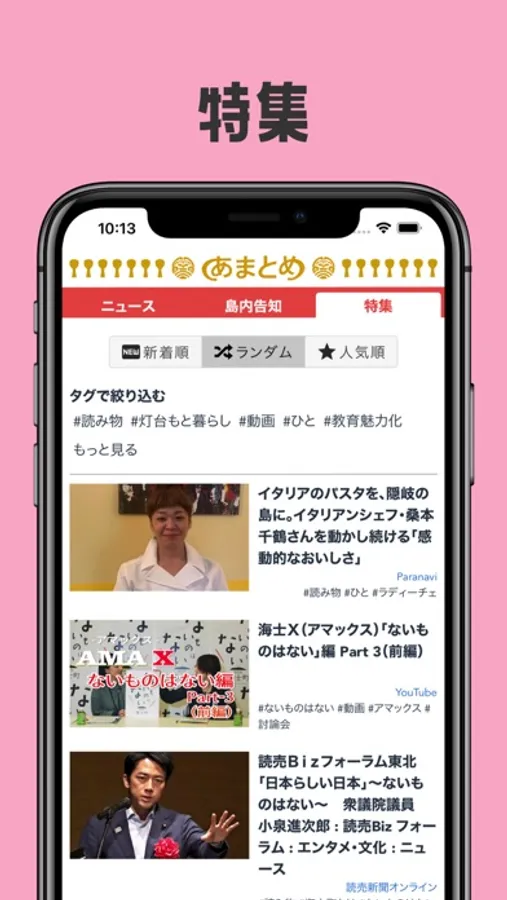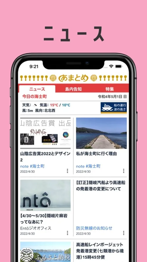 •海士町に関するあらゆる記事を新着順や特集として掲載しており、海士町に関する情報を投稿することもできます。