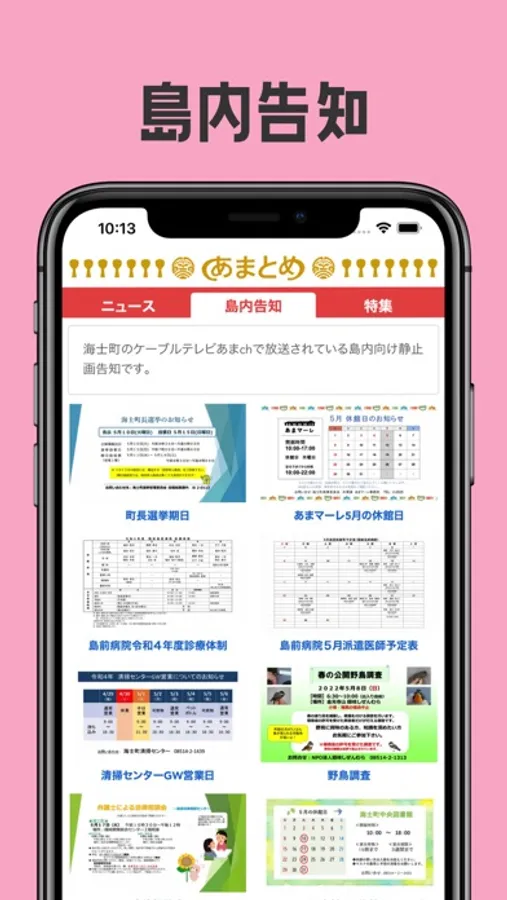 •島内情報として、海士町のケーブルテレビでお知らせしている静止画告知や防災無線情報を閲覧できます。