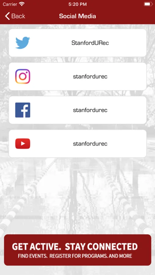 This is the official app for Stanford University Recreation & Wellness Programs and Services. Stay up to date with all the latest news and announcements for all your favorite Rec & Well programs. Through the app you may register for programs, view up to the minute schedules and receive important notifications to stay connected with all the action.