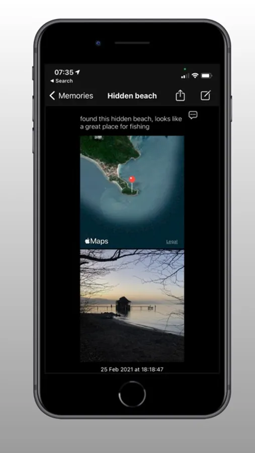 All your memories are collected in a list and shown on a map from which you'll conveniently find back to your saved memories, guided by the app (using apple maps).