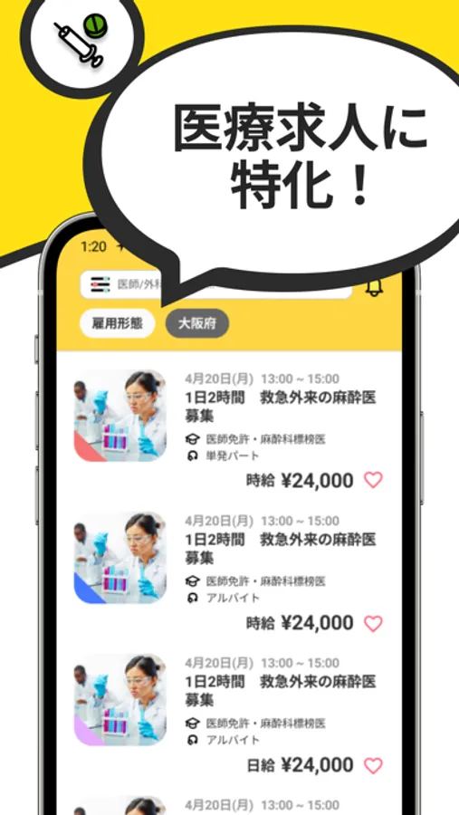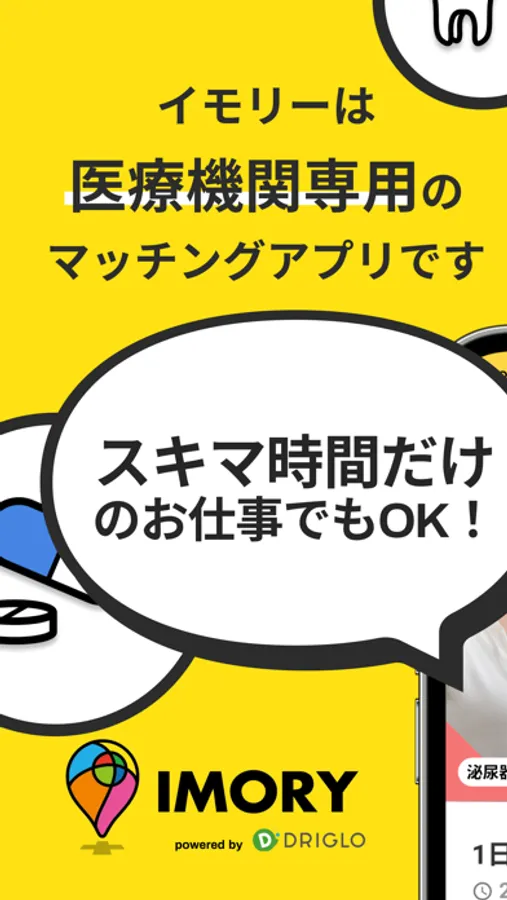 イモリーは医療従事者とクリニックをアプリで結ぶプラットフォームです。医療系の求人に特化しているので求人情報が探しやすい。