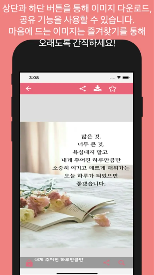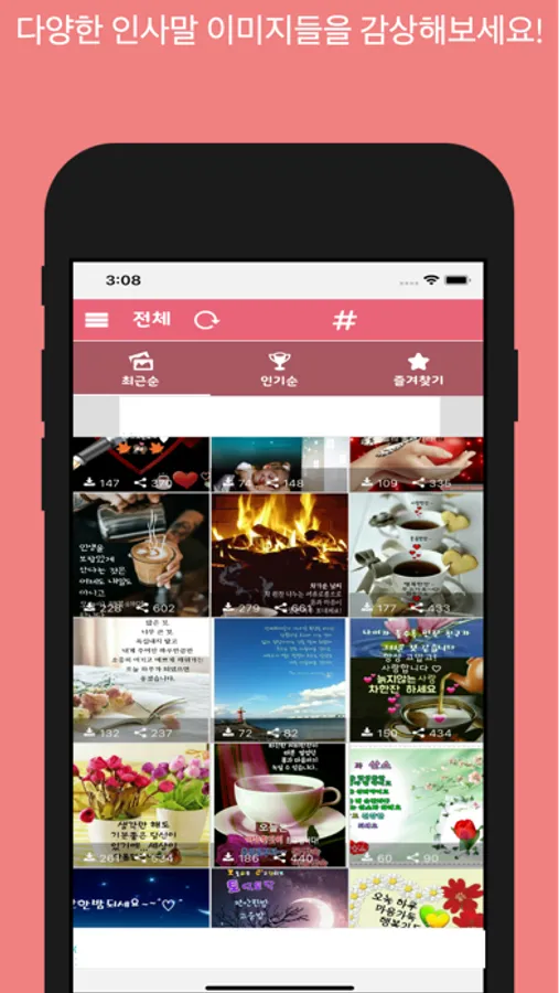 아침 인사말, 저녁 인사말, 안부 인사말, 주말 인사말 등등 인사에 관련된 아름다운 이미지들을 직접 기기에 다운받거나 다운받지 않고도 카카오톡, 라인 등의 메신저 및 페이스북, 트위터 등의 SNS에 공유할 수 있습니다.