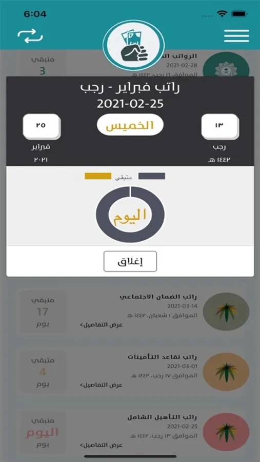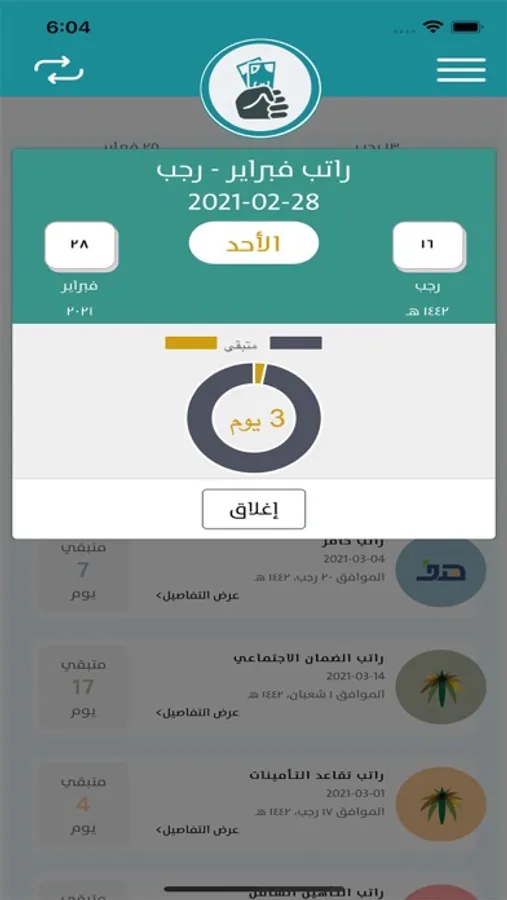 تطبيق موعد الرواتب يقدم كم عدد الايام المتبقية عن نزول كل من :