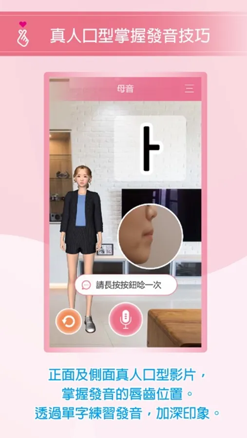正面及側面真人口型影片,掌握發音的唇齒位置。透過單字練習發音,加深印象。