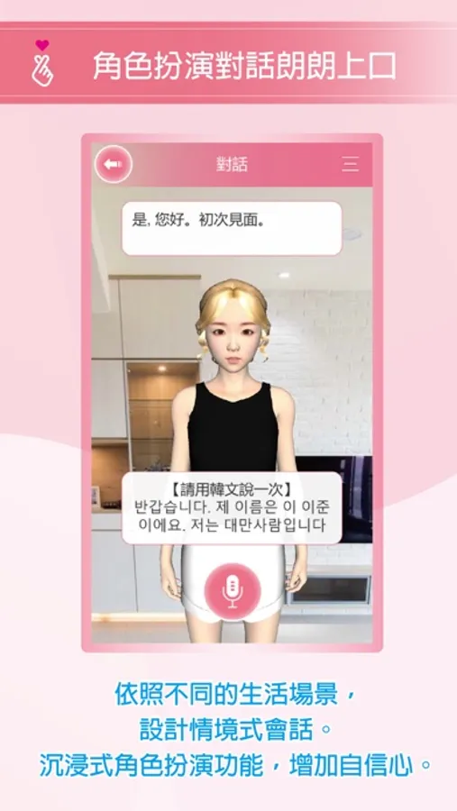 依照不同的生活場景,設計情境式會話。沉浸式角色扮演功能,增加自信心。