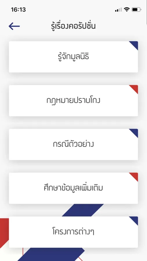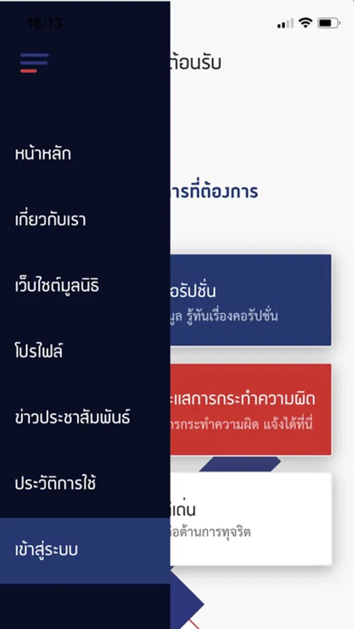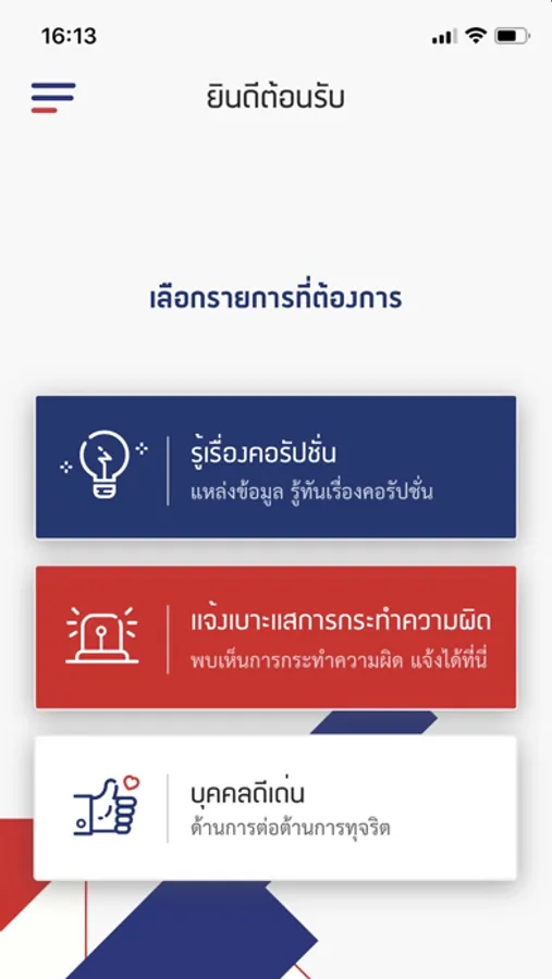 แอปพิเคชั่นสำหรับแจ้งข้อมูลการทุจริต จัดทำขึ้นเพื่อเป็นอีกช่องทางในการแจ้งข้อมูล เบาะแสต่างๆ โดยสามารถเลือกให้รายละเอียดการแจ้งเหตุต่าง ๆ ได้หลากหลายวิธี เช่น การถ่ายรูป การแนบรูป การอัดวีดิโอ และการอัดเสียง เป็นต้น