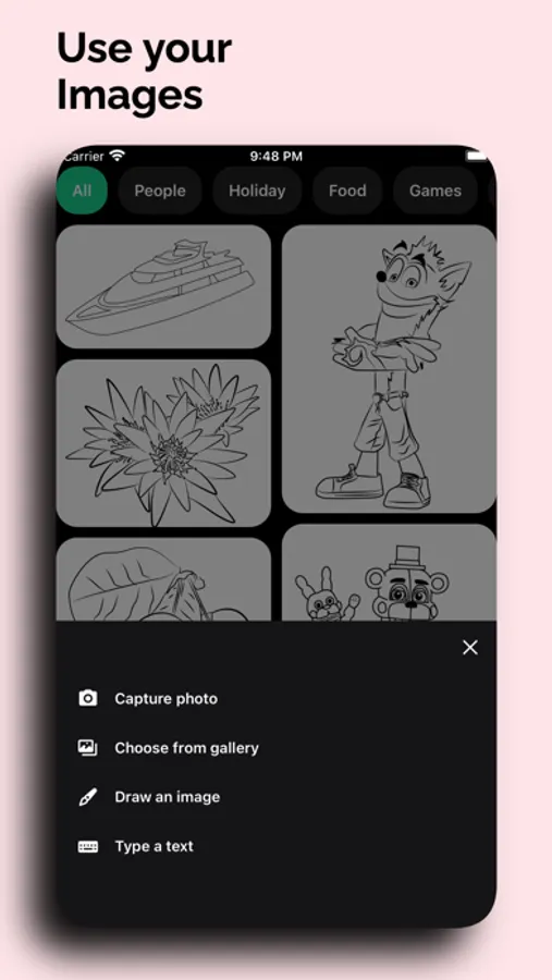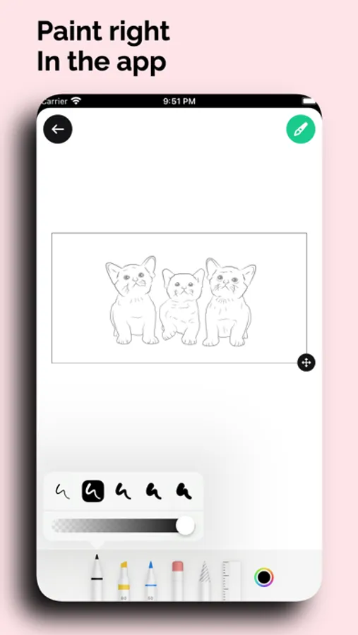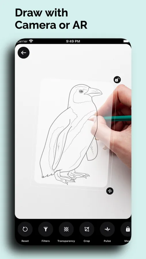 Select the required image. It can be loaded from the device memory, as well as download the basic stencils available inside the application. The program will automatically position the sketch on the canvas, while giving you the opportunity to change the image parameters. The picture can be rotated, enlarged or made transparent using the corresponding sliders located at the bottom of the screen.