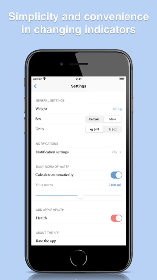 The app will automatically calculate your daily norm and will remind you to drink some water at the prescribed time.