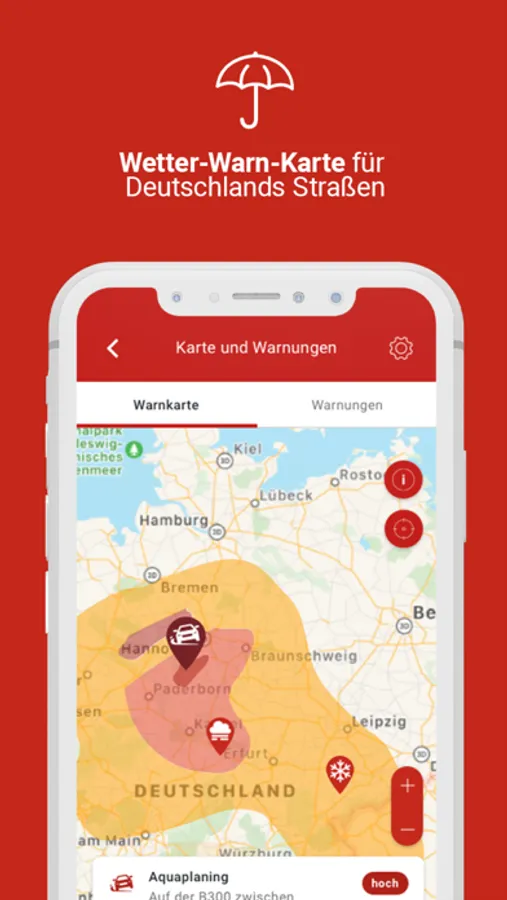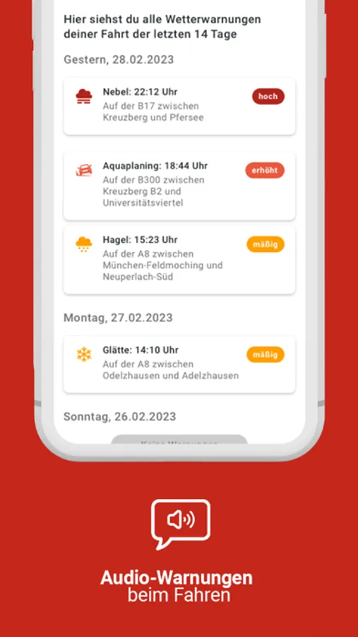 Beim Autofahren auf Autobahnen oder Bundesstraßen warnt Dich Protect Me mit Audiowarnungen vor Aquaplaning, Hagel, Sturm, Glätte und Nebel. Dabei sagt die App Dir an, in welcher Entfernung die Wettergefahr vor Dir auf Deiner Strecke liegt.