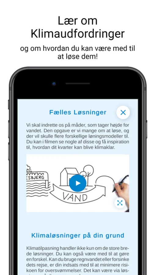 Vandstanden i havet stiger, grundvandet står højere end tidligere og mere ekstremt vejr i form af regn fører mere vand med sig. Det er de forskellige scenarier, som du kan lege med i denne app. Samtidig finder du inspiration til at gøre regnvandet til en ressource i dit kvarter eller på din egen grund.