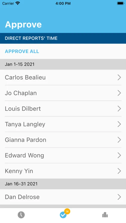 Approve by individual or by group. Approve weekly, semi monthly or monthly.
