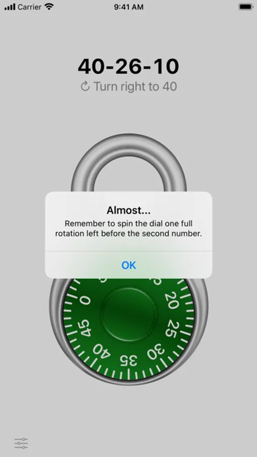 If you make a common mistake when opening the lock—like forgetting to spin one rotation to the left before your second number—you’ll be notified with a friendly hint.