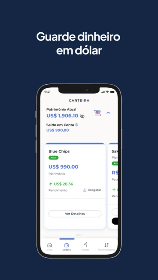 - Faça aportes em real e ter a conversão automática para dólar e outras moedas