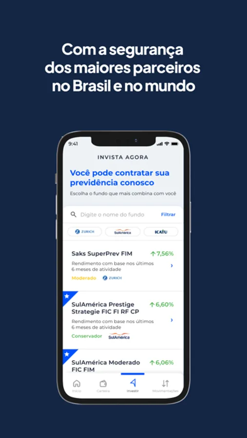 Os investimentos que complementam seu esforço você encontra aqui. Dos melhores fundos de previdência privada a portfólios internacionais - para você crescer com os maiores mercados do mundo.