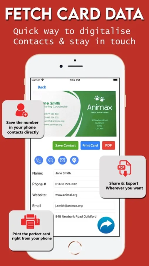 Instant recognition of business cards right on your iPhone. Fetch contact information from a business card directly to your iOS Contacts.