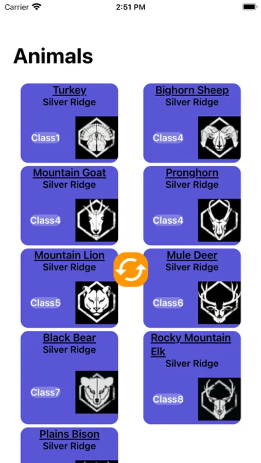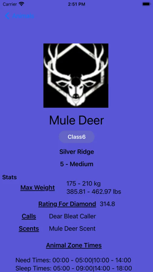 This is an app to help with searching animals in COTW on a per map basis. It is no longer needed to have a stack of papers to flip through trying to find the animals weight and score! Also included is the weapons to use and what times to find animals and where.