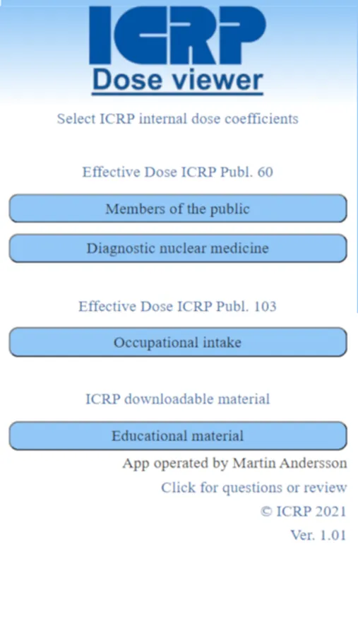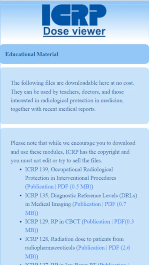 The App also contains the ICRP educational materials in downloaded PDF-files, giving the possibility to easily access this material. The material can be used by teachers, doctors, and those interested in radiological protection in medicine, together with recent medical reports.