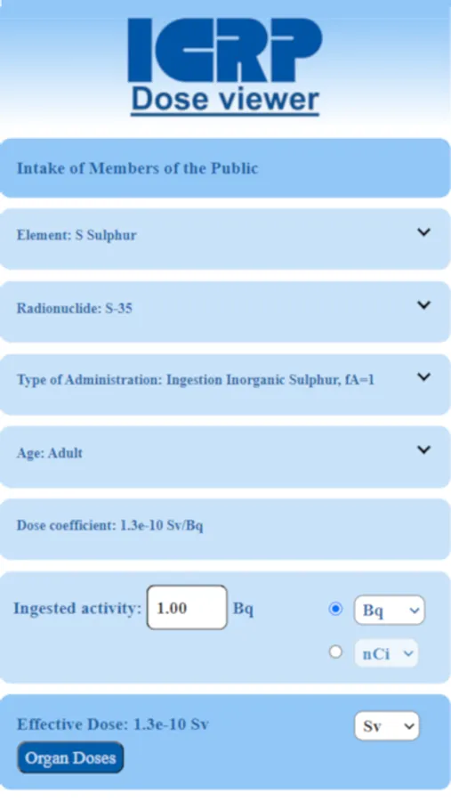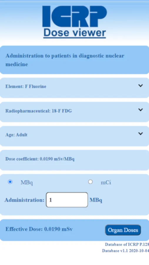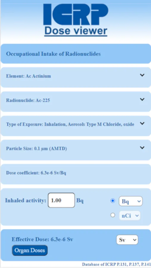 The ICRP Dose Viewer contains the effective dose from different published ICRP dose coefficients from internal exposure. The App contains ICRP published absorbed and effective dose coefficients for occupational, general public and patients.