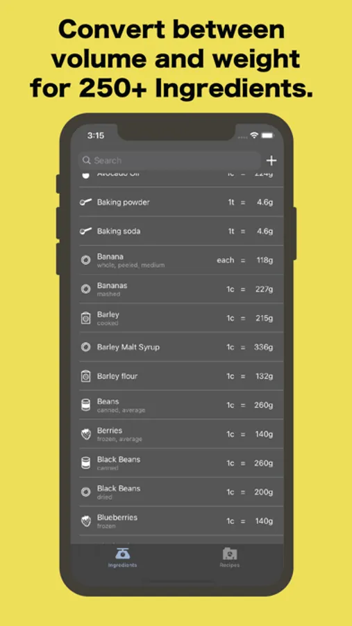 Easily convert ingredients between volume and weight. Comes with data for 250+ common ingredients, and also allows you to easily add your own.