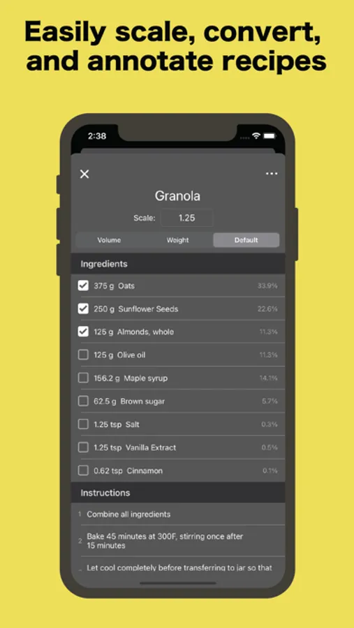 Construct a dynamic, personal cookbook. Create, save, annotate, iterate, and cook from your recipes, which are stored in an easy-to-use format that allows for quick conversion between volume and weight and easy scaling. Record notes as you make changes and improve your recipes.