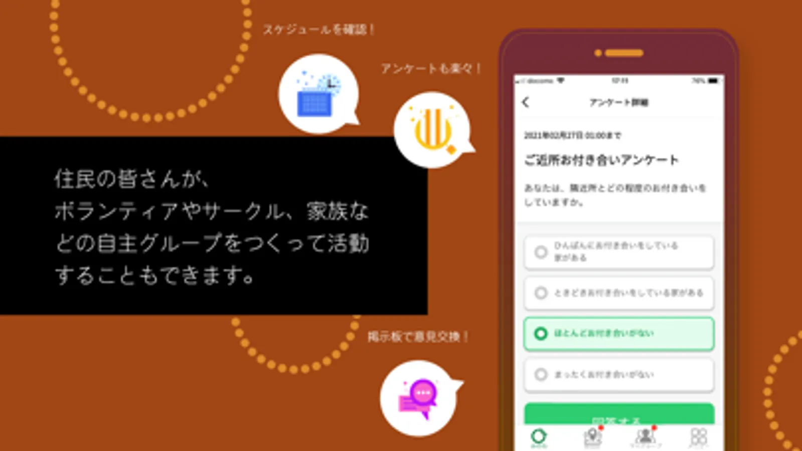 ◆掲示板、アンケート、スケジュールなど様々な方法で発信される地域の情報を手に入れることができます。