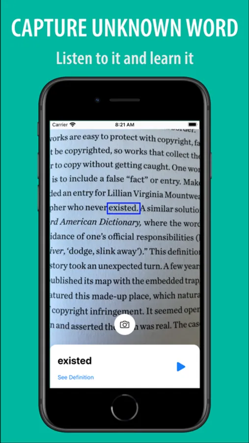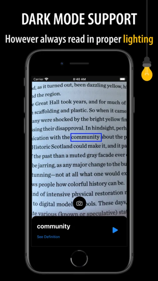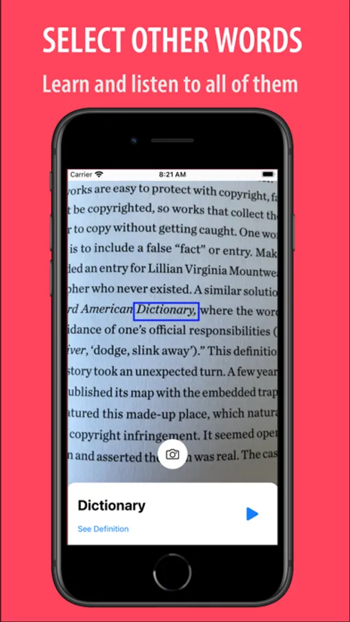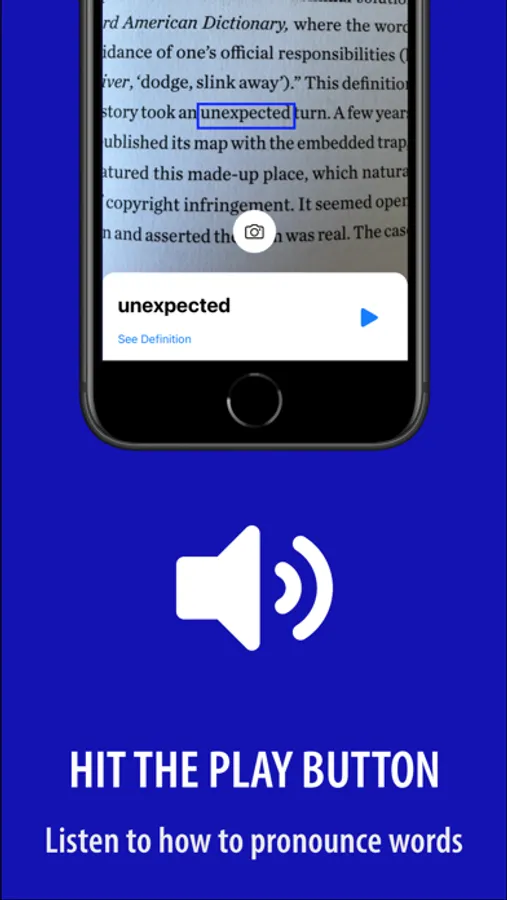 Open the app on your iPhone and hold your phone over the page with the word on it. Select the word on your phone screen. Once you select the word it will appear at the bottom of the screen with a quick Play button to listen to the word. You can also click on see description to learn more about the word.
