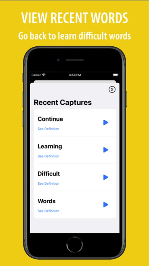 You can click "View Recent Captures" to see and learn words you have scanned in the past.