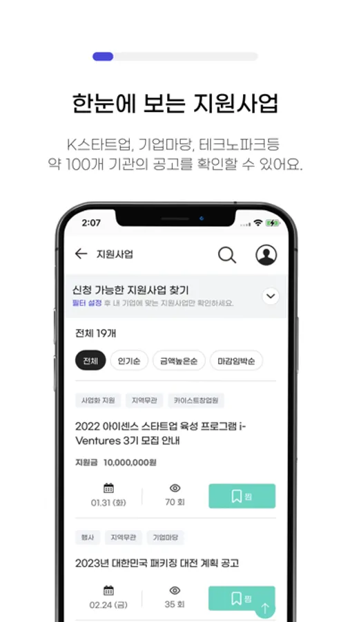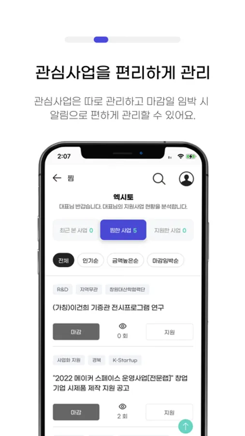 관심있는 지원사업은 ‘찜’으로 따로 관리하고, 마감일 임박 시 알림으로 쉽고 편하게 관리할 수 있어요.