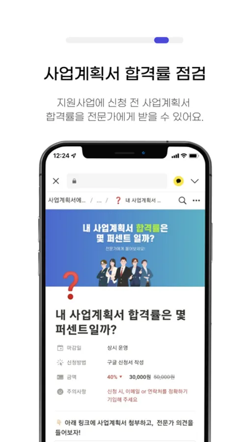 지원사업 신청 전 전문가에게 합격률을 확인하는 ‘사업계획서 사전 점검 서비스’를 이용할 수 있어요.