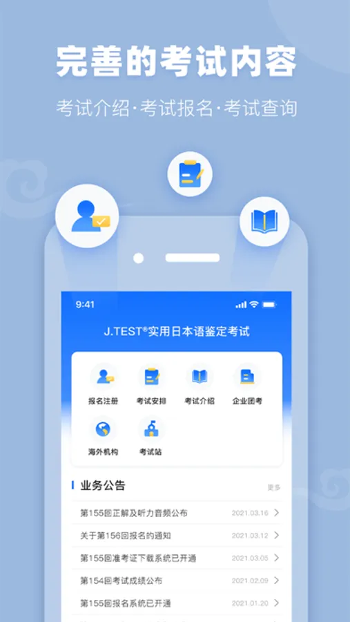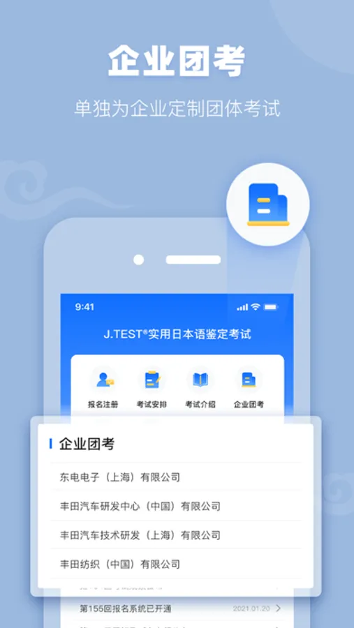 J.TEST考试全称为实用日本语鉴定考试(以下简称J.TEST)。于2007年8月获得了国家劳动和社会保障部的认可(劳动部文件)。其主要功能就是对母语为非日本语的人员进行日本语能力的测试。在上世纪九十年代初期,日本经济发展到鼎盛时期时,由于日本国内人力资源的严重不足,采用在日本的外国人进入公司成为了不可替代的办法。为配合对在日本的外国人的日语鉴定,1991年,日本语检定协会开发了J.TEST。因为其鉴定方式科学合理,J.TEST很快成了众多企业几乎是唯一的选择。并逐渐成为录用海外员工语言能力的依据,也有许多公司作为员工派遣、提升时的依据。所以每年都有许多企业组织员工集体参加J.TEST,其中也不乏有世界著名的大公司。