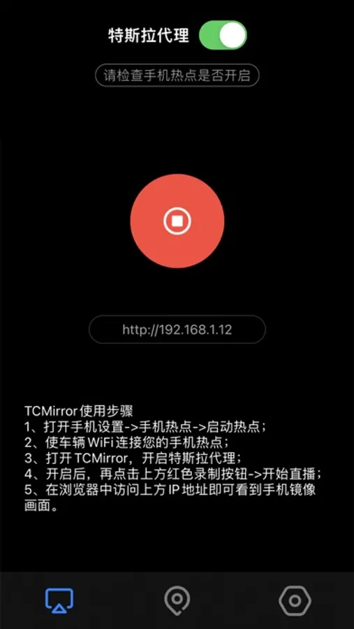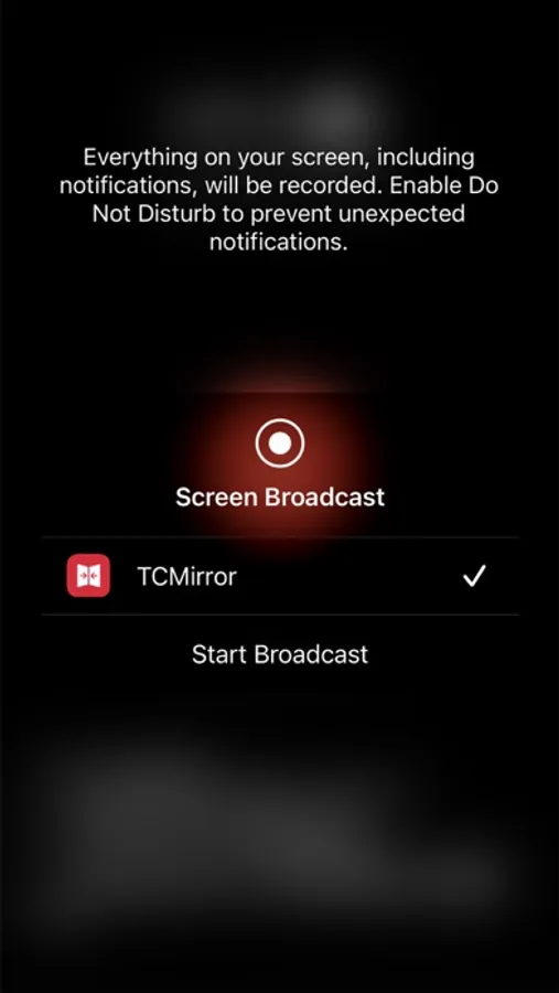 3. Click the RED record button to start Screen Broadcast in the TCMirror App.