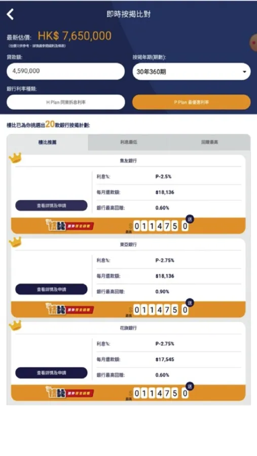 (5)精選最優惠按揭計劃:【樓比】輸入按揭、轉按或加按金額,即可按該按揭金額,顯示各銀行當時最優惠的按揭計劃,並即時計算出不同銀行回贈。