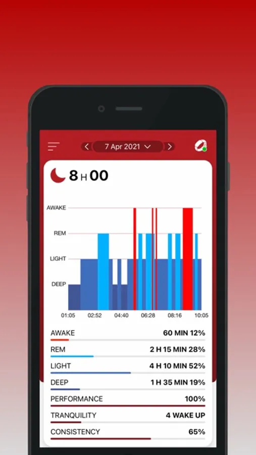 See your sleep stages — REM, deep, light — and discover your ideal bedtime and how many times you woke up.